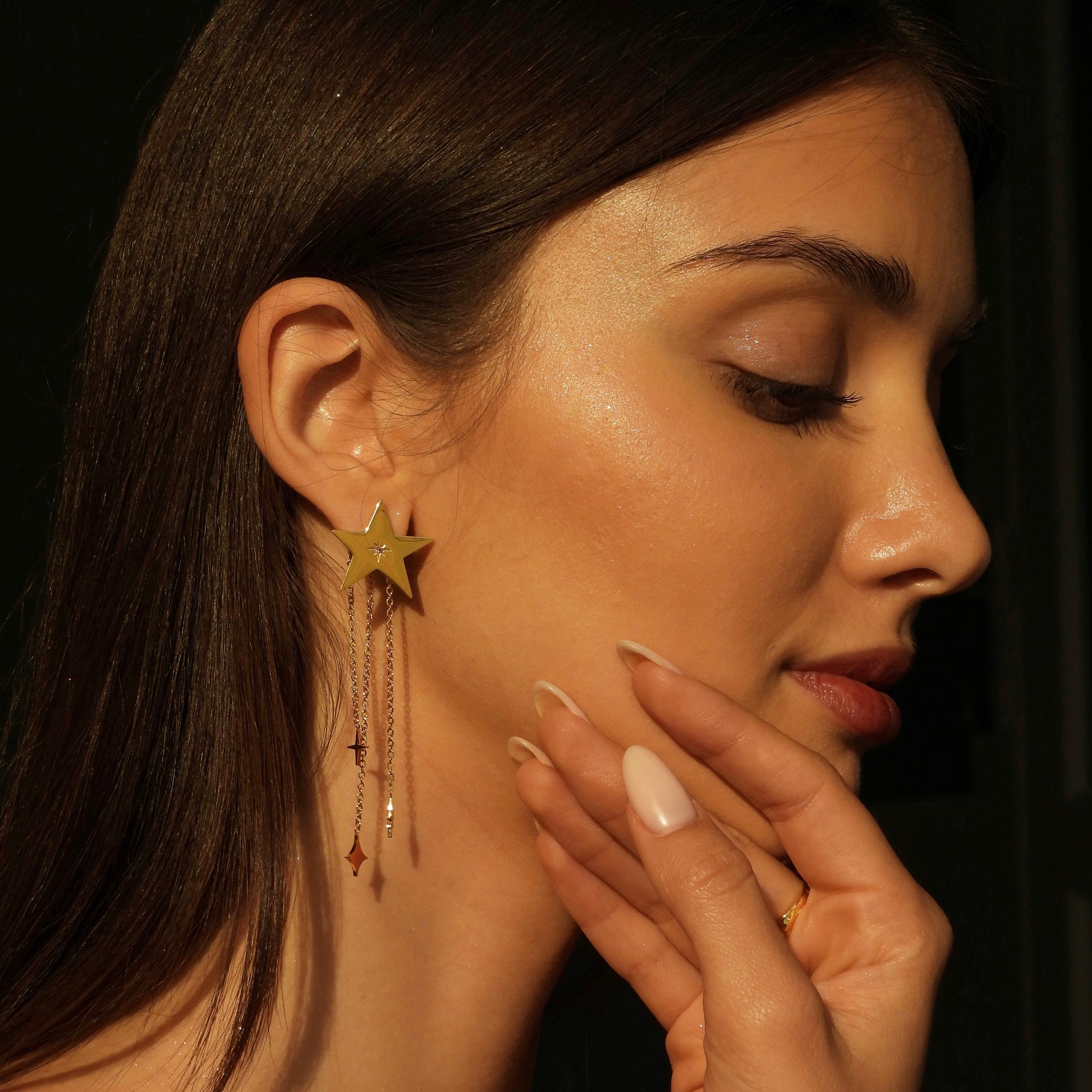 Catch a falling star and wear it on your ears! These earrings emulate a shooting star and feature a star stud and a tassel of three small stars. The tassel can be removed to style the big star on its own.